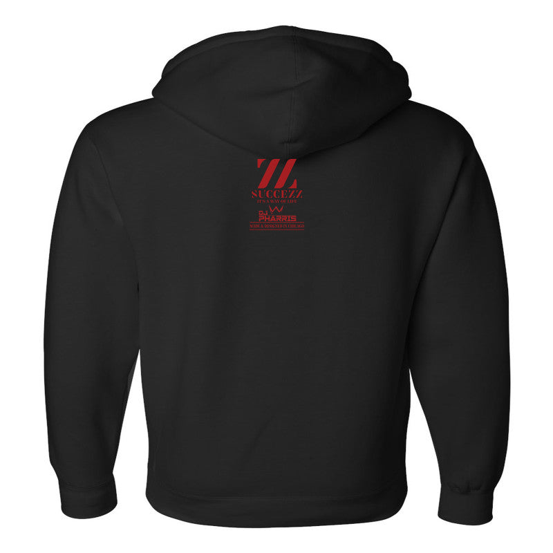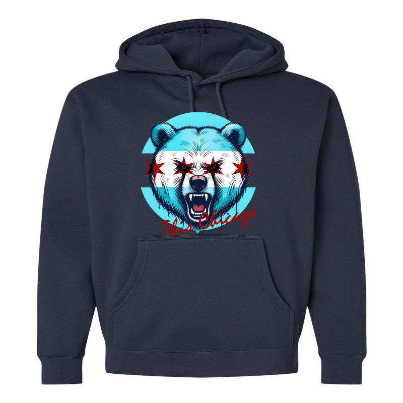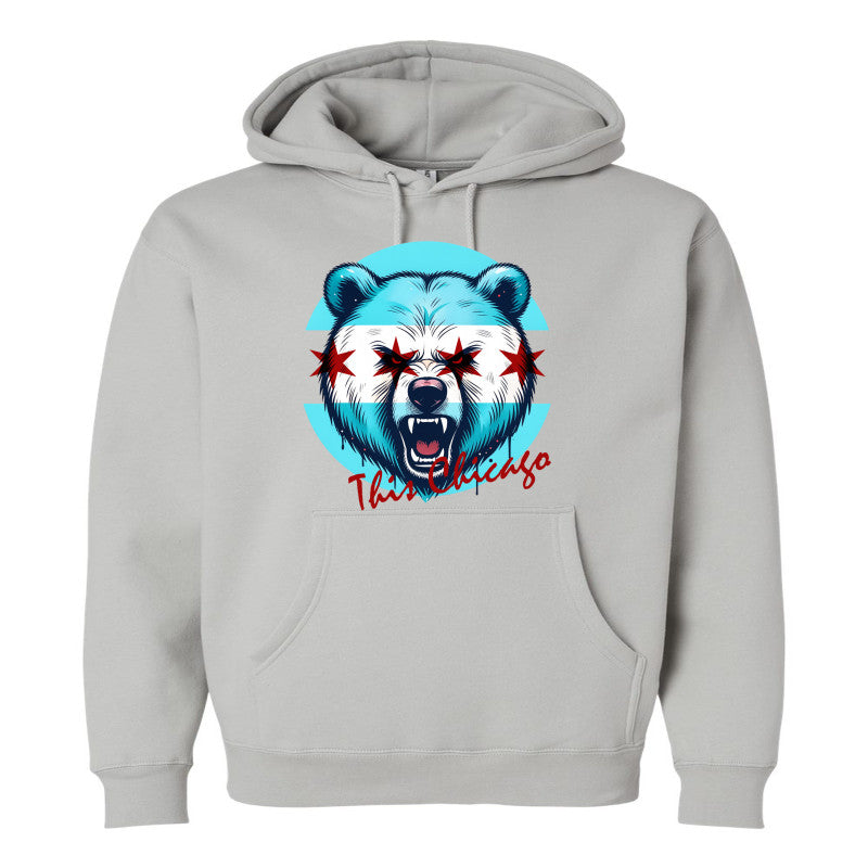 "This Chicago" collaboration hoodie by Succezz and DJ Pharris features a powerful graphic of a roaring bear integrated with the iconic light blue stripes and red stars of the city flag. Made in Chicago for the ultimate Chicago Bears fan, capturing the fierce spirit of the city and its football legacy in a single, stylish statement.